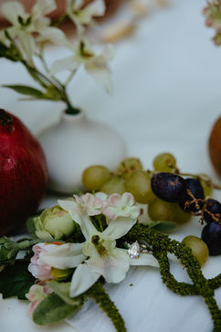 Featured florals: green hydrangeas, anthuriums, ranunculus, and draping amaranthus, muted dusky pink roses and dahlias, white roses, hydrangeas, orlaya lace, and cascading orchids.